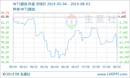 8月1日,受中美貿(mào)易戰(zhàn)談判再度陷入僵局以及美聯(lián)儲(chǔ)降息提振美元走強(qiáng)影響,美國WTI原油期貨市場價(jià)格暴跌,報(bào)53.95美元/桶,跌幅為4.63美元,布倫特原油期貨價(jià)格暴跌,報(bào)60.50美元/桶,跌幅為4.55美元。美國原油期貨重挫7%,創(chuàng)6周以來的最低收盤價(jià)。布倫特原油期貨價(jià)格下跌超過6%,創(chuàng)七周以來最低收盤價(jià),同時(shí)創(chuàng)2016年2月以來的最大單日跌幅。